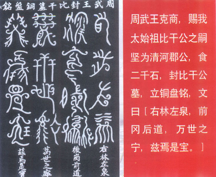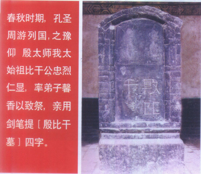 歷代帝王無不嘉獎崇頌,周武王克紂,封比干墓,赐铜盘铭,铭曰“右林左泉,后岗前道,万世之宁,兹焉是宝”十六字。孝文帝南巡亲诣吊祭,立祠塑像,以示尊崇。春秋時期,孔夫子曾為比干墓提书曰“殷比干墓”四个大字。并曰:“殷有三仁,公居第一。”(三仁即比干、微子、箕子。)贞观十几年,唐太宗文武皇帝诏旌比干节操,追赠太师,谥忠烈公,遣官持节致祭,加绘太师图像,以表扬公之忠烈。宋元明清历代帝王嘉奖、崇祀、蔗礼者更为隆重。