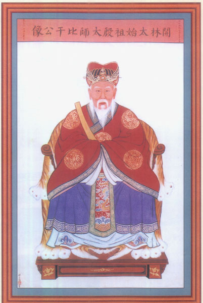 比干出自黄帝,历唐、虞、夏、商三十四而生比干。为殷太丁之子、帝乙之第、纣王之叔,有贤德,官少师。